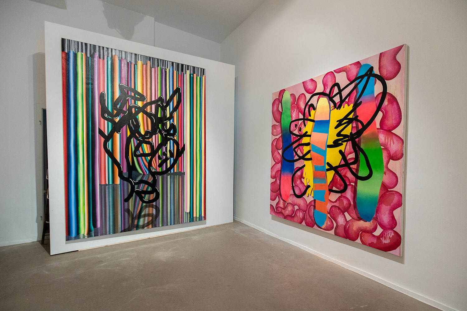 A strange figure remains impassive on a stage. A curtain lifts to reveal the bizarre frame, which can only be identified as an anthropomorphic figure by the implied face. Behind it is a second curtain, which condenses the pictorial space into a narrow threshold. The curtain is - among many other symbols for the separation of different levels of being - a recurring motif in Philippe Rebosz' paintings. As an architectural element, it is ephemeral: with the gentle movement of a hand, it is eliminated and yet separates worlds. The illusion of space is found in all of Rebosz' paintings. Sometimes Philippe Rebosz's paintings appear very abstract. Still, however, they are not. The painter skillfully juggles with the most diverse painting traditions: His paintings cite classical abstraction and concrete painting, minimalist traditions, American color field painting and pop art. Airbrush technique and informal blobs meet figurative elements, hard edges meet filigree color gradients, thinly glazed color layers meet impasto applied color surfaces. With subtle humor, Rebosz combines these supposed antagonisms into an individual pictorial cosmos. Color gradients, stains and splashes live in the underground and tell of a mysterious and often explosive undercurrent. They keep the process of making the picture and its growth explicitly present. In front of it, on the surface of the painting, these representatives of its own history of creation are superimposed by abstract, large-scale pictorial elements, thus formally calming the surface. These layers of painting oscillate between the opposite poles of presentation and withdrawal: an observation that applies equally to the content of many the artist‘s works. Philippe Rebosz opens curtains, presents stages or reflective surfaces, and puts his polymorphous protagonists in the spotlight. At the same time secrets are kept here on all levels. Despite their visual seductiveness, the attractiveness in motif and color, Philippe Rebosz's works are far away from the purely decorative, from mere stage spectacle. Everything that seems spontaneous, direct and playful turns out to be planned, controlled and cerebral at the same time. Everything that presents itself as tongue-in-cheek is at the same time very serious. Everything that seems to be a product of chance is at the same time carefully and accurately composed.